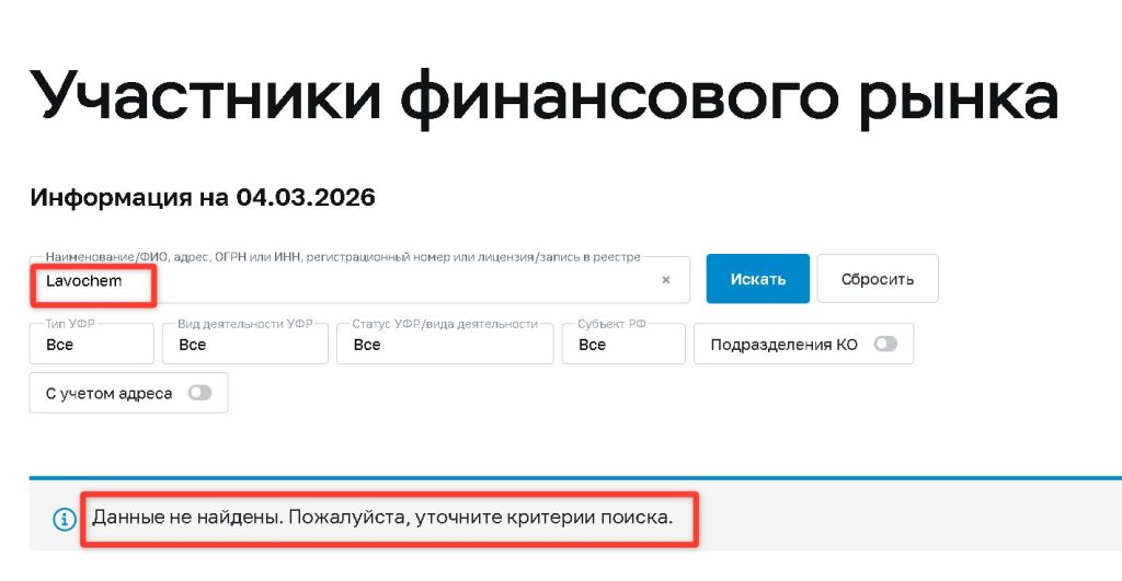 Проверка по официальным реестрам ключевых регуляторов дает ожидаемый результат: