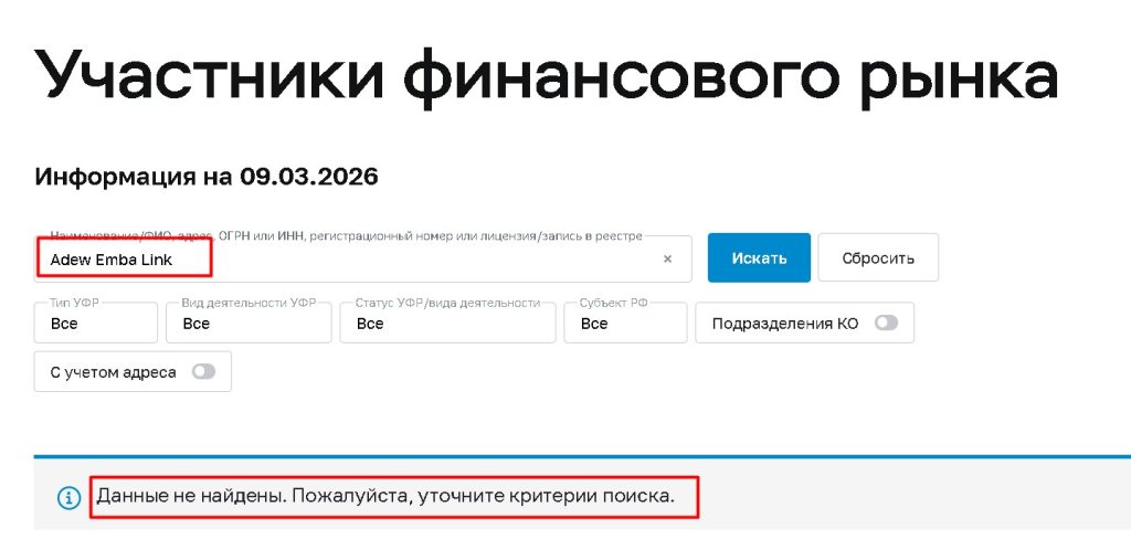 Как и у всех предыдущих проектов из этой серии, у Adew Emba Link нет и не может быть лицензий авторитетных финансовых регуляторов. Проверка по реестрам ЦБ РФ, FCA, CySEC, ASIC гарантированно не даст никаких результатов. Деятельность компании, если она связана с финансами, является полностью нелегальной на всех регулируемых рынках.