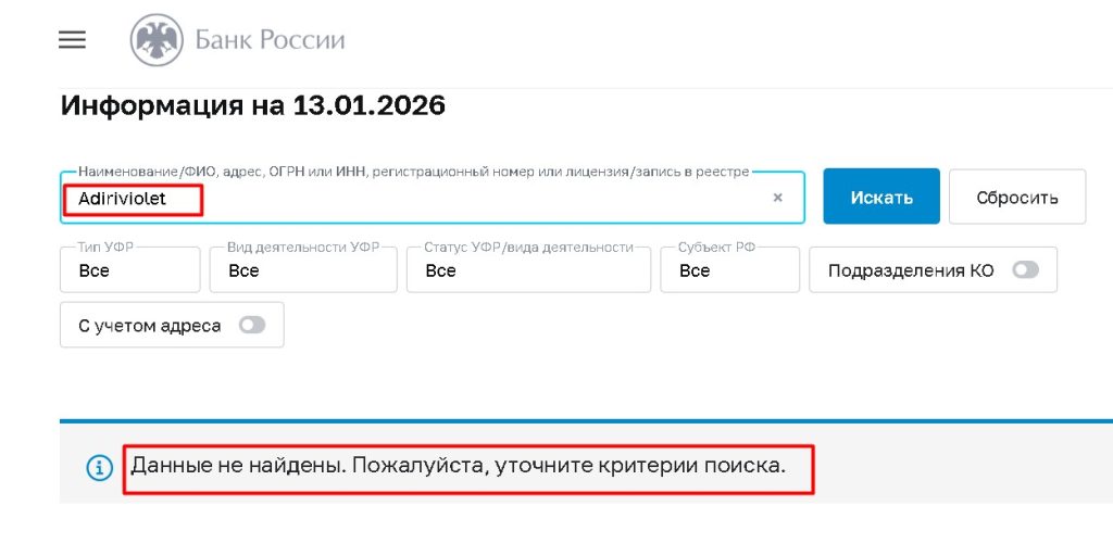 📢 Если у вас есть информация о действиях платформы Adiriviolet или вы хотите проверить другую компанию, сообщите через форму обратной связи на сайте https://tvoybroker.com/proverka-kompanii-na-obman/.