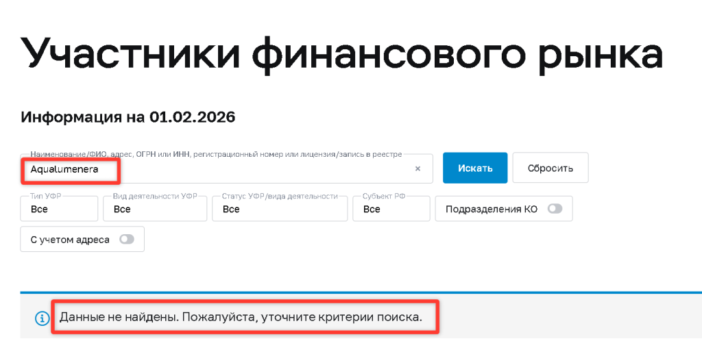 - Регулятор в РФ. Для легального привлечения клиентов из России компания должна быть включена в реестр форекс-дилеров Банка России. В этом реестре Aqualumenera отсутствует.