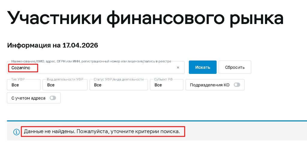 📢 Если у вас есть информация о действиях платформы Cozaninc или вы попали в аналогичную ситуацию, сообщите через форму обратной связи: https://tvoybroker.com/proverka-kompanii-na-obman/.