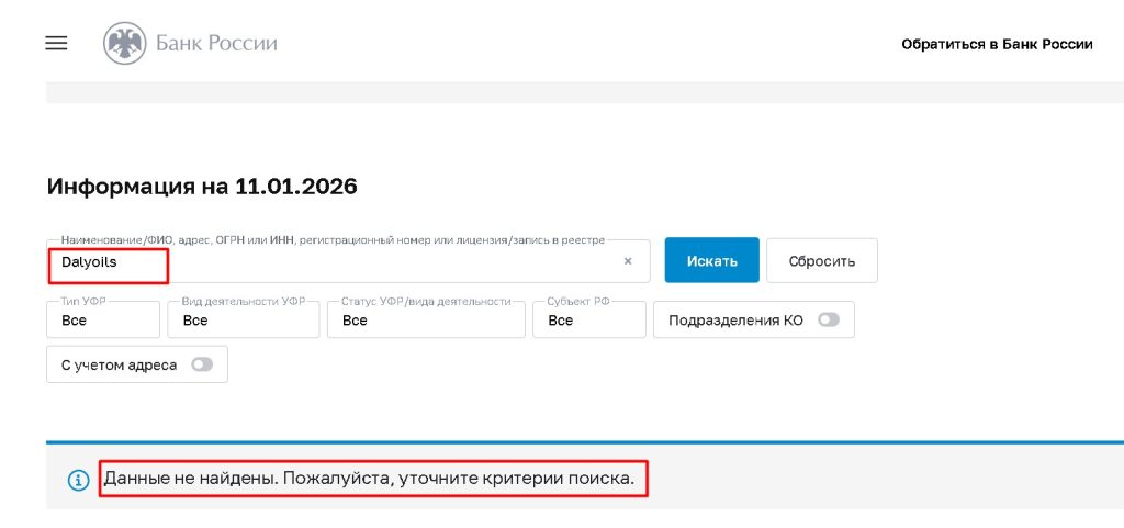 📢 Если у вас есть информация о действиях платформы Dalyoils или вы хотите проверить другую компанию, сообщите через форму обратной связи на сайте https://tvoybroker.com/proverka-kompanii-na-obman/.