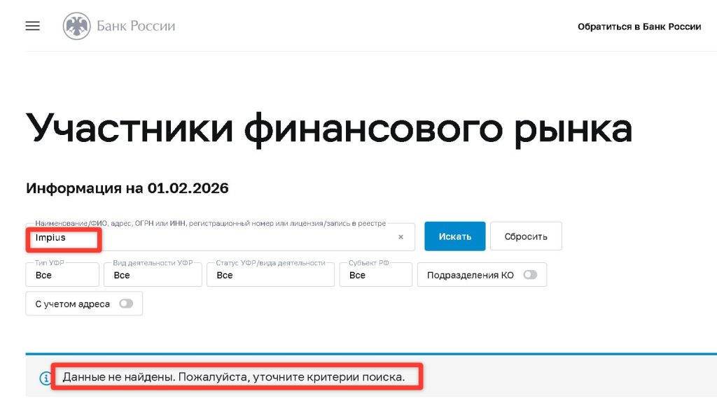 Мы настоятельно рекомендуем инвесторам избегать любых финансовых операций с Impius и аналогичными проектами. Перед внесением средств в любую платформу необходимо самостоятельно проверять наличие лицензии в официальных реестрах регуляторов и изучать отзывы на независимых ресурсах.