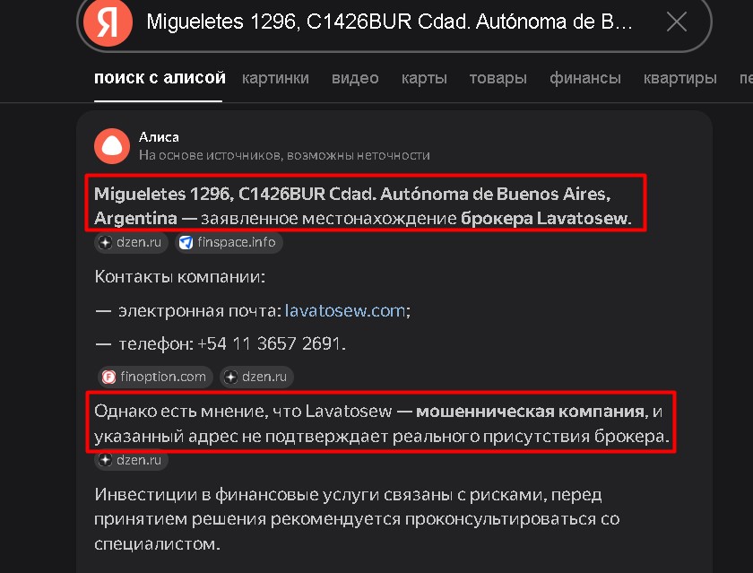 | Юридический адрес | Migueletes 1296, C1426BUR, Буэнос-Айрес, Аргентина | Адрес является массово используемым виртуальным офисом, не подтверждающим реальное присутствие компании. |