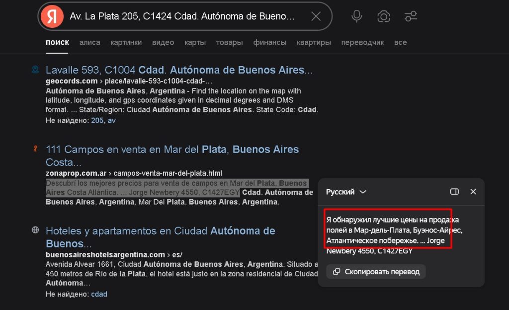 - Адрес. Указанный адрес в Буэнос-Айресе требует верификации через картографические сервисы. Часто такие адреса оказываются виртуальными офисами.