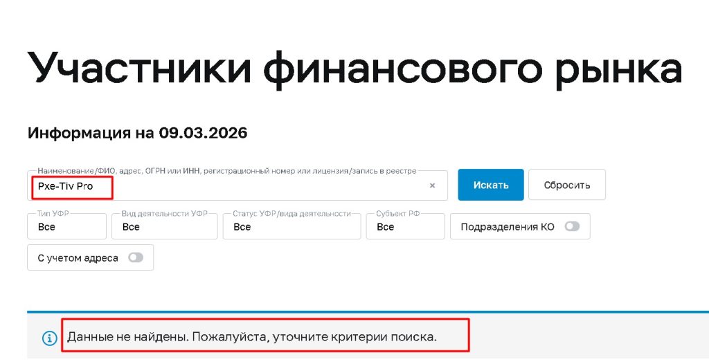 Как и у всех предыдущих проектов из этой серии, у Pxe-Tiv Pro нет и не может быть лицензий авторитетных финансовых регуляторов. Проверка по реестрам ЦБ РФ, FCA, CySEC, ASIC гарантированно не даст никаких результатов.