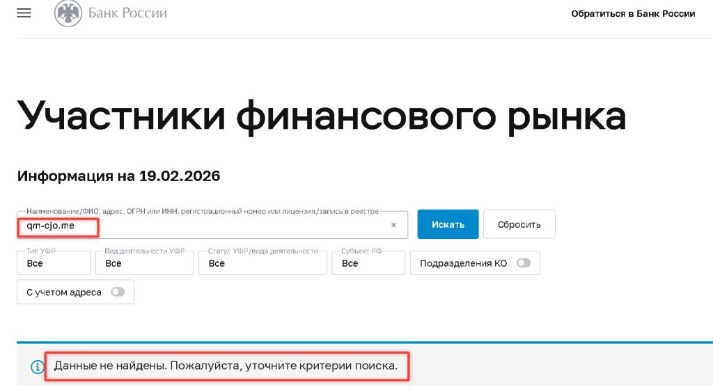 Крайне тревожным сигналом является полное отсутствие публично доступной информации о компании. Сайт qm-cjo.me: