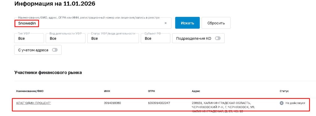 Мы настоятельно рекомендуем избегать любого сотрудничества с Snowedin. Перед внесением средств в любую финансовую компанию всегда проверяйте наличие лицензии у регулятора, историю домена, юридические данные и отзывы на независимых ресурсах.