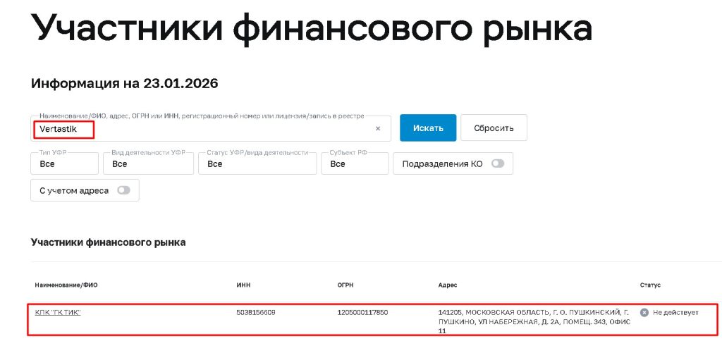 | Название и сайты | Vertastik. vertastik.com, vertas-tik.link, vtsa-tk.co. | Классический признак мошенников — наличие нескольких доменов, включая нетипичные .link и .co. |