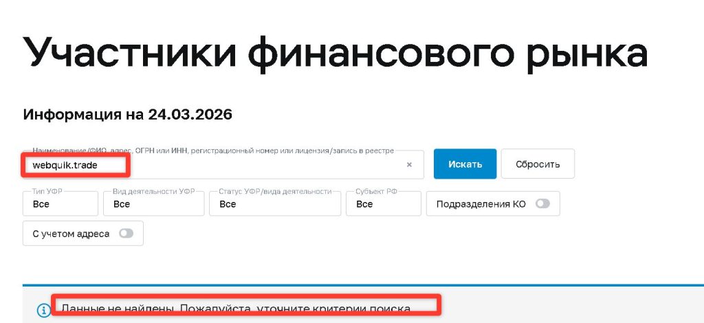 В любой финансовой деятельности главный критерий надежности — прозрачность, наличие лицензии и возможность проверить каждую операцию. У webquik.trade нет ничего из этого.